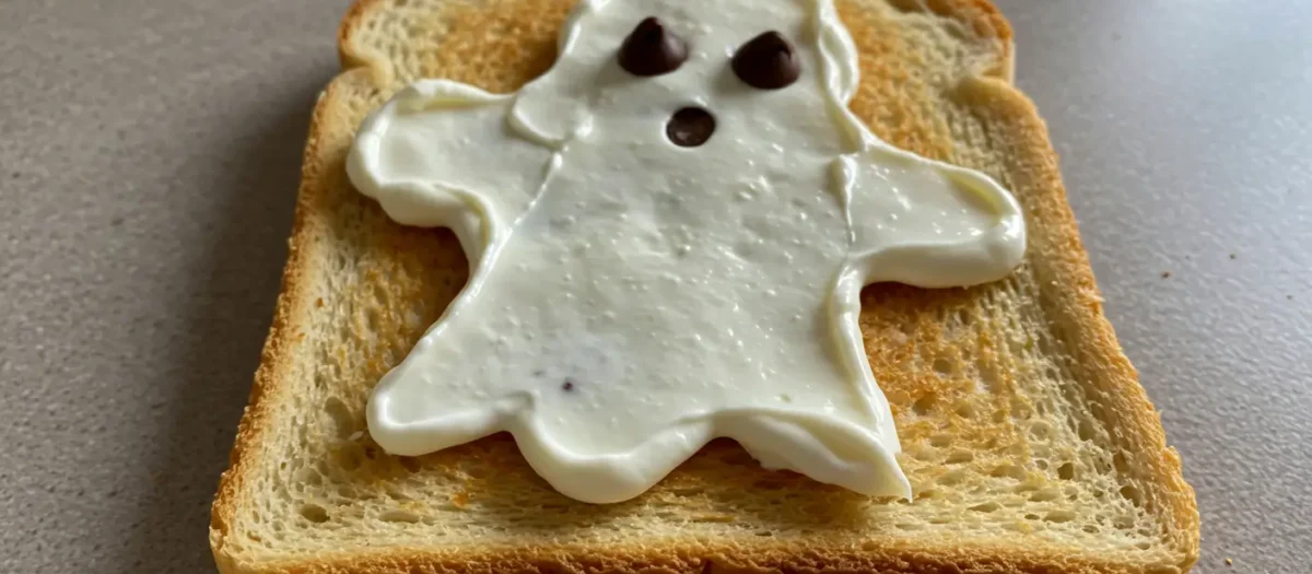 Step 3: Create Your Ghosts Here’s where the magic happens – and by magic, I mean controlled chaos. Using a butter knife or small spoon, spread the cream cheese in a rough ghost shape on each piece of toast.