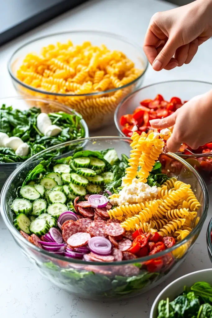 - In a spacious mixing bowl, combine cooled pasta, cubed salami, diced cucumber, red onion, chopped spinach, mozzarella pearls, and sun-dried tomatoes.