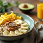 - Assemble the bowl: Once the oats are cooked, pour them into a bowl. Top with scrambled eggs, sliced avocado, chia seeds, and a few slices of banana or other Low FODMAP fruits.