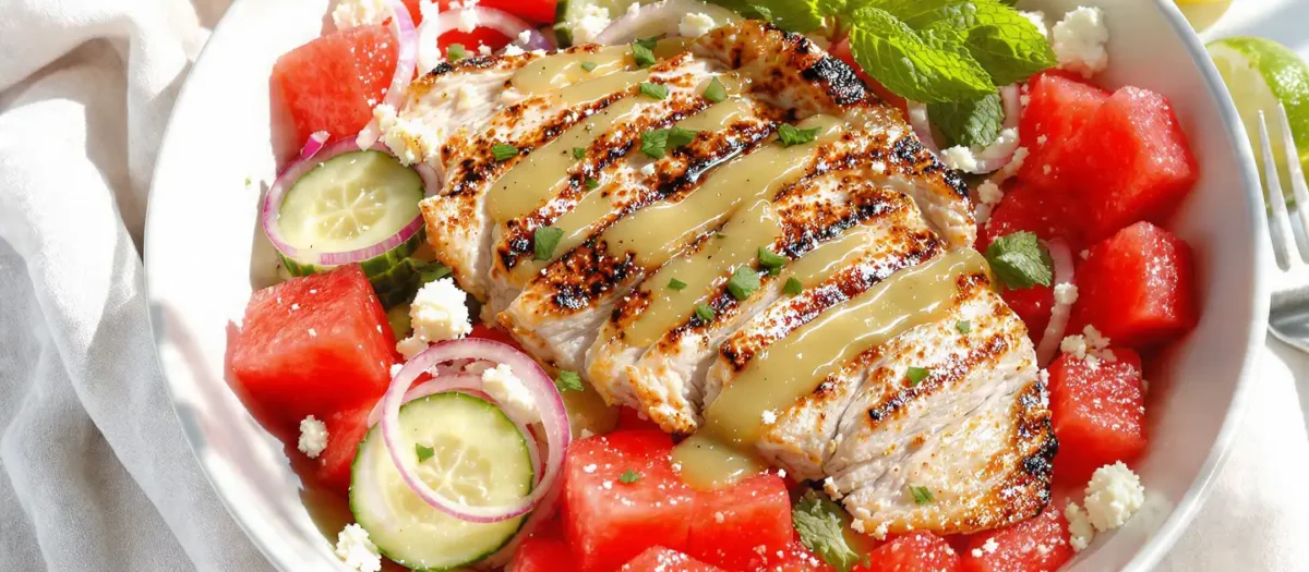 - Top with sliced chicken. Serve immediately — watermelon releases water as it sits.