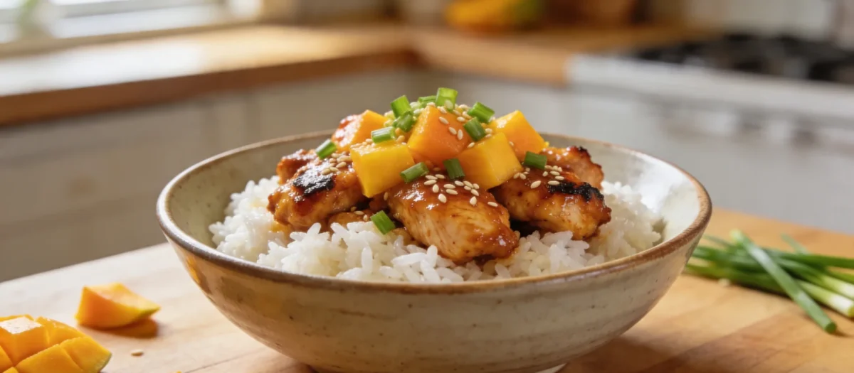 A delightful recipe featuring tender chicken glazed in a sweet-spicy sauce served over fluffy rice with fresh mango.
